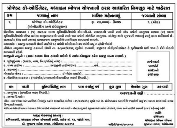 मध्याहन भोजन योजना, गांधीनगर प्रोजेक्ट को-ओर्डिनेटर भर्ति 2016 :