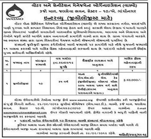 Water and Sanitation Management Organisation (WASMO), Gandhinagar द्वारा Geologist की भर्ति हेतु जाहेरात प्रसिध्ध की गइ है। भर्ति के बारेमें अधिक जानकारी नीचे दी गइ हैं।