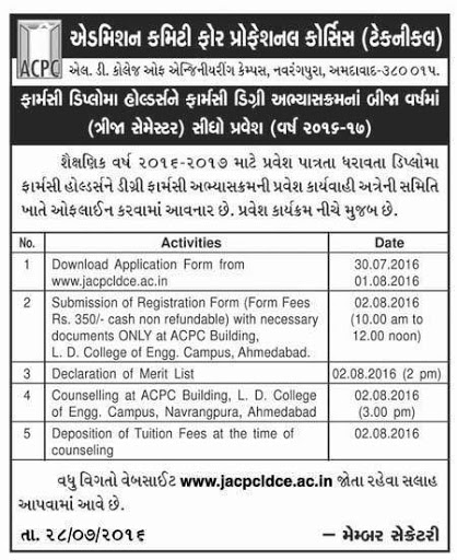 Admission Committee for Professional Courses (ACPC), Ahmedabad published advertisement for Diploma to Degree Pharmacy Admission 2016