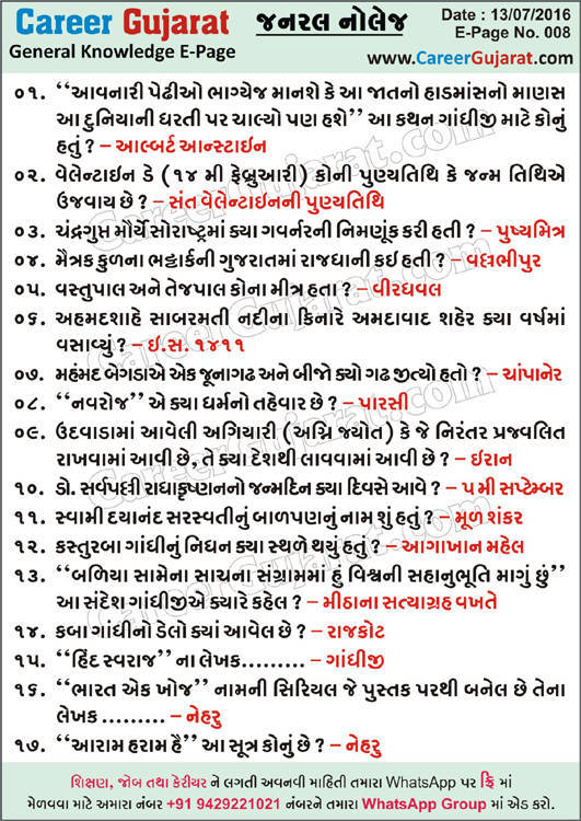 Career Gujarat General Knowledge Page - Dt. 13/07/2016 :