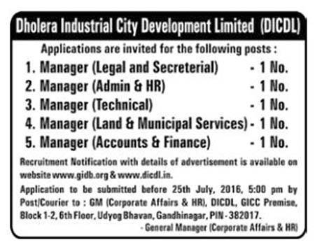 Dholera Industrial City Development Limited (DICDL) published notification for Manager (Legal and Secretarial), Manager (Admin & HR), Manager (Technical), Manager (Land & Municipal Services) and Manager (Account & Finance) Posts.
