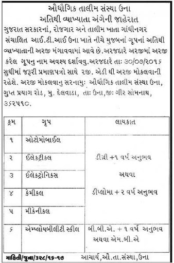 - Send Application to This Address : Industrial Training Institute (ITI) Una, Gupt Prayag Road, Mu. Delwada, Ta. Una, Dist. Gir Somnath. Pincode - 362510.