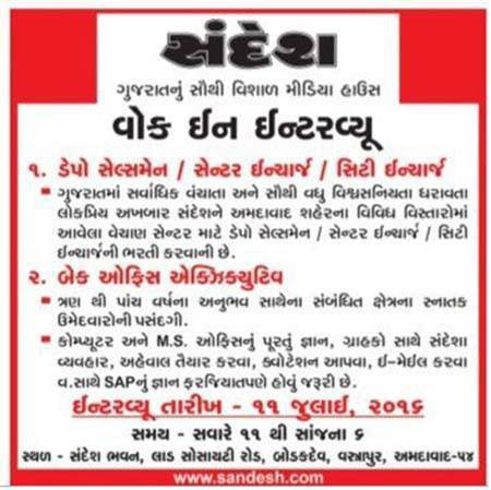 - Walk in Interview Place : Sandesh Bhavan, Lad Society Road, Bodakdev, Vastrapur, Ahmedabad-55