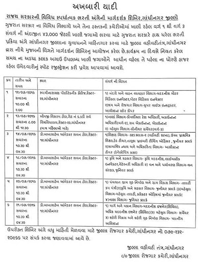 Gujarat Sarkar na vividh vibhago ane tena hastak ni kacheri ma khali rahel Varg-1 thi Varg-3 sanvarga ni andajit 43000 jetli khali jagyao bharva mate Gujarat Sarkare hath dharel bharti prakriya ange Gandhinagar Jilla na Yuvadhan ne mahitigar karva mate jilla vahivati tantra Gandhinagar dwara "Margdarshak Seminar" nu aayojan karva ma aavel chhe. Margdarshak Seminar ange ni vadhu vigat niche aapva ma aavel che.