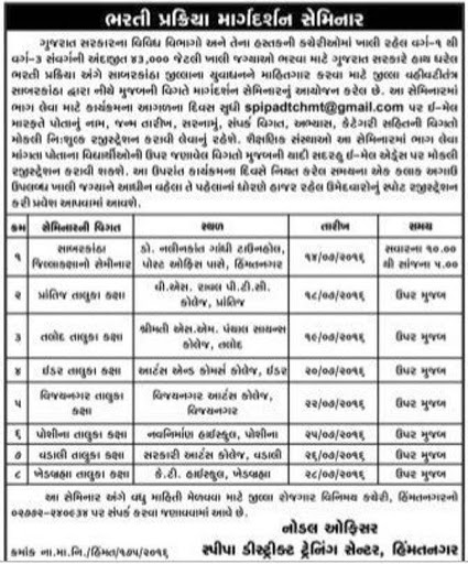 Gujarat Sarkar na vividh vibhago ane tena hastak ni kacheri ma khali rahel Varg-1 thi Varg-3 sanvarga ni andajit 43000 jetli khali jagyao bharva mate Gujarat Sarkare hath dharel bharti prakriya ange Sabarkantha Jilla na Yuvadhan ne mahitigar karva mate jilla vahivati tantra Sabarkantha dwara "Margdarshan Seminar" nu aayojan karva ma aavel chhe. Margdarshak Seminar ange ni vadhu vigat niche aapva ma aavel che. Vaghu vigat niche aapva ma aavel chhe.
