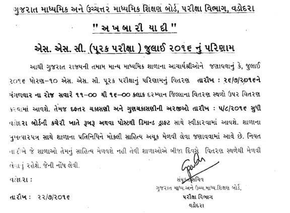 Gujarat Secondary and Higher Secondary Education Board, Vadodara published notification for Std. 10th (SSC) Purak Pariksha / Supplementary Exam July 2016 Result Distribution.