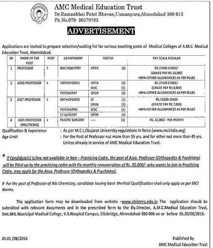 AMC Medical Education Trust, Ahmedabad published recruitment advertisement for Professor, Associate Professor, Assistant Professor and Assistant Professor (Practicing) posts.